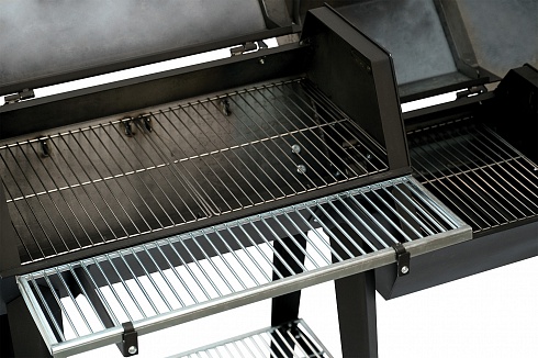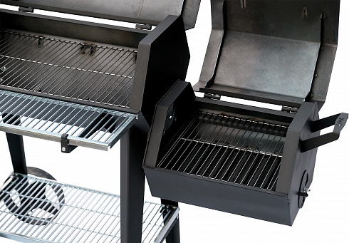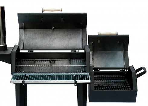 3.Горизонтальная камера в форме бочки (габариты 800x500 мм) – рабочая зона для барбекю, гриля и горячего копчения. Оборудована крышкой, открывающей внутреннюю полость по всей длине. А также решетками из нержавеющей пищевой стали и: внутренней и наружной (прикреплена/приварена сбоку корпуса).