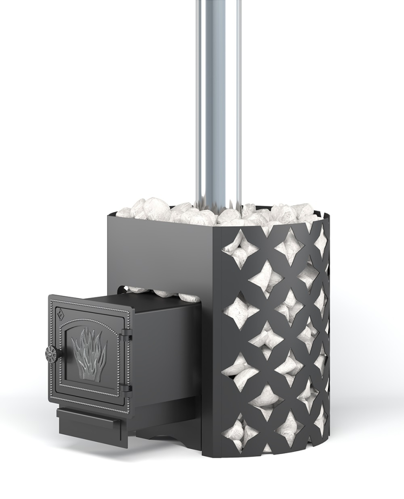 Кожух для открытой каменки диаметром 620 миллиметров вмещает в себя до 140 килограммов камней крупной и средней фракции.