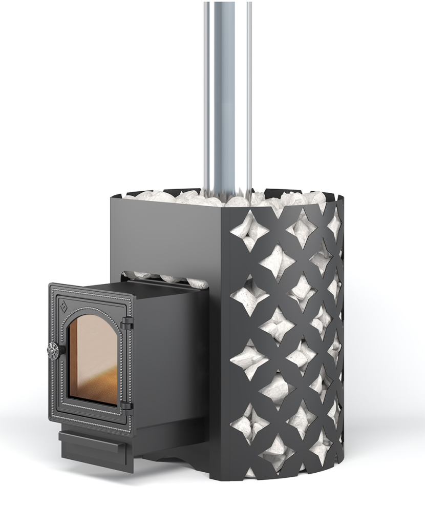 Для устройства наружной открытой каменки печь ЭТНА оснащается металлическим кожухом с прорезным рисунком оригинального дизайна. Пространство между печью и кожухом из двухмиллиметровой стали заполняется камнями для бани, которые выполняют роль теплонакопителя, перераспределяют тепло от стенок топки и защищают парящихся от жёсткого инфракрасного излучения. Воду подают на нагретые камни, с которых полученный пар распространяется по всему объёму парной.