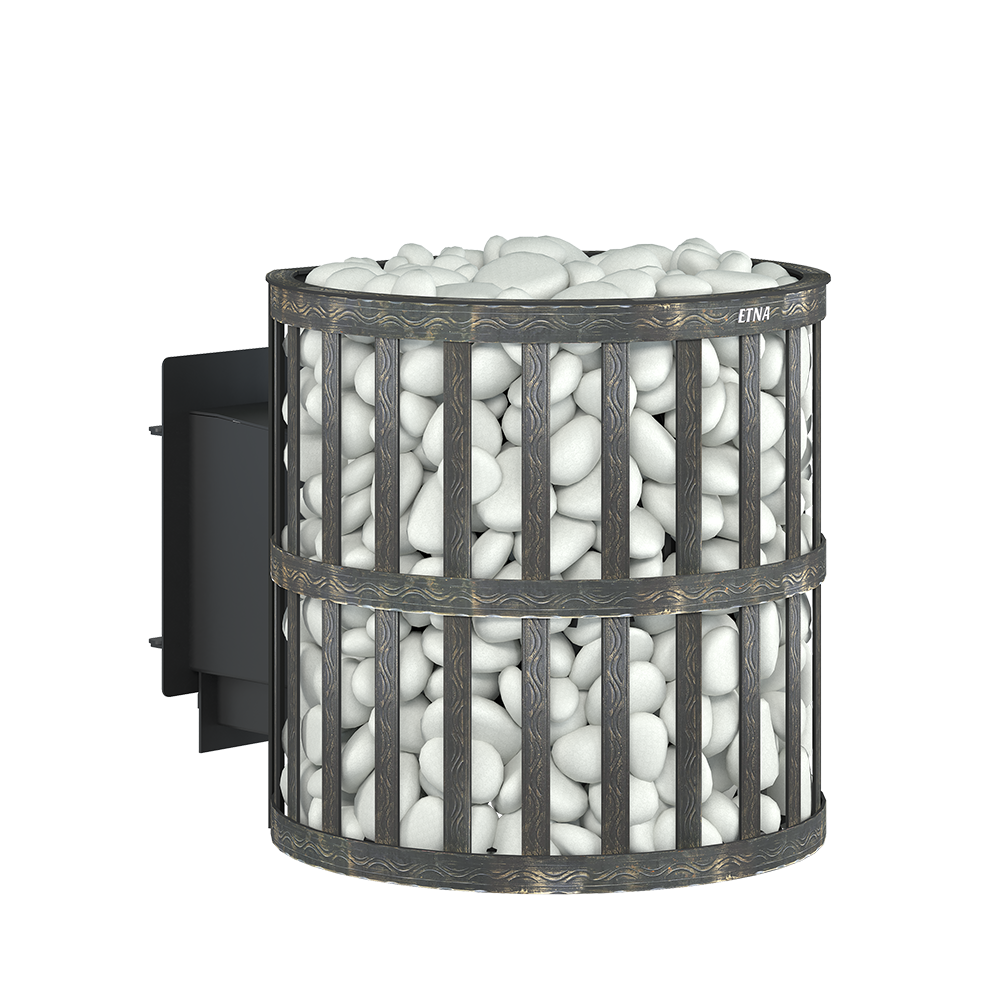 Для устройства наружной открытой каменки печь ЭТНА 24 (210) М оснащается сеткой из стальной ленты. Узор на наружной поверхности сетки патинирован термостойкой бронзовой краской. Пространство между печью и сеткой заполняется камнями для бани, которые выполняют роль теплонакопителя, перераспределяют тепло от стенок топки и защищают парящихся от жёсткого инфракрасного излучения. Воду подают на нагретые камни, с которых полученный пар распространяется по всему объёму парной.