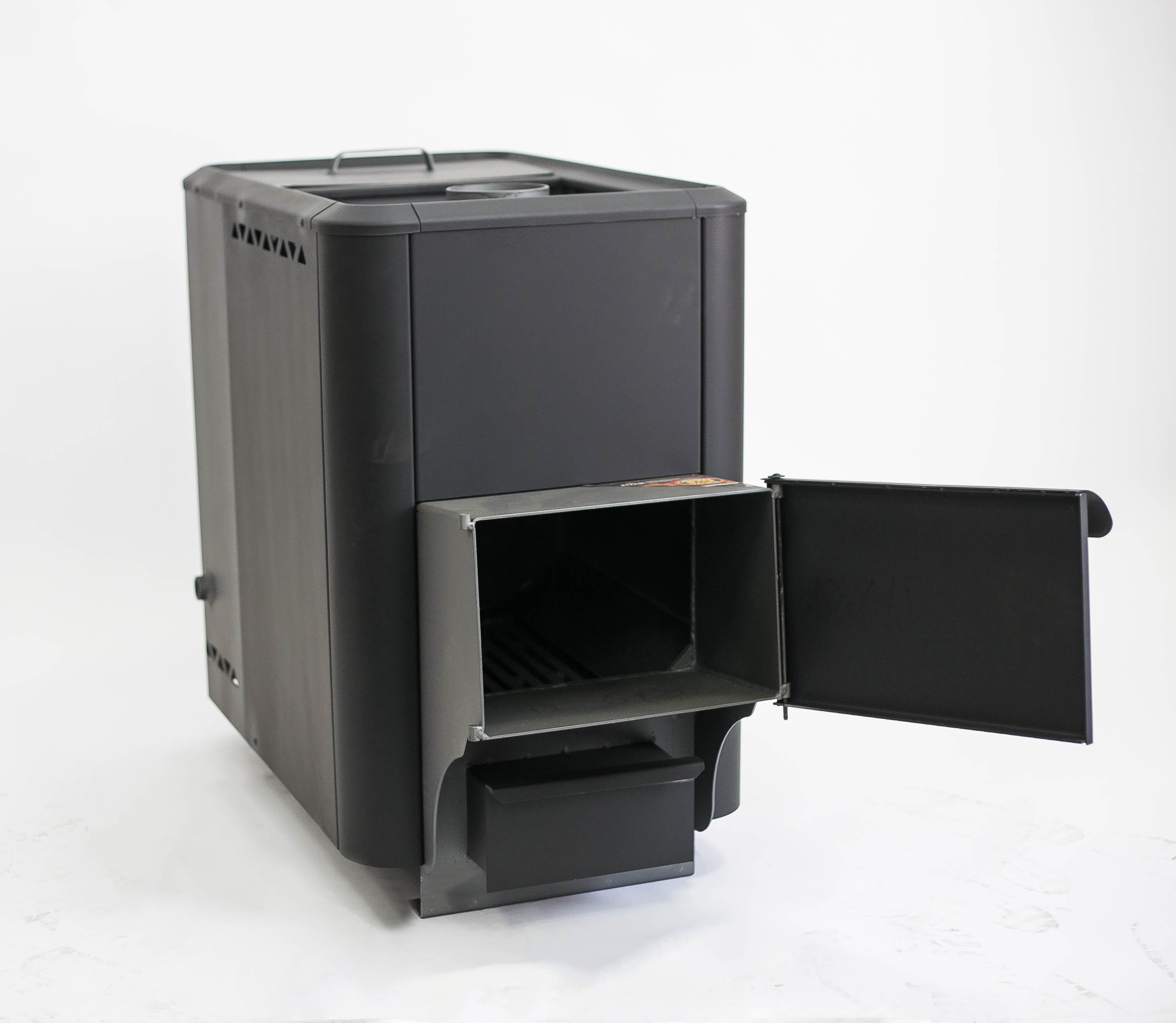 Компактная, надежная конструкция обеспечивает отличный пар в бане площадью до 20 метров. Открытая каменка вмешает 50-60 кг камней. Топится углем или дровами. Встроеннный бак обеспечивает необходимое для купания количество горячей воды.