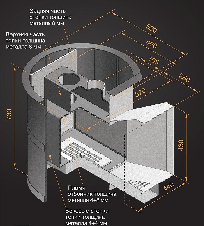 Топка печи выполнена из специальной конструкционной стали толщиной до 12 мм. Сталь благодаря своей устойчивости к высоким температурам не подвергается деформации. Топочная дверца изготовлена из высококачественного чугуна. Длинная колосниковая решётка из массивного литейного чугуна, обеспечивает равномерное горение дров, столь необходимое для банной печи. Выдвижной зольный ящик позволяет удалить накопившуюся золу, не прерывая горения и эффективно регулировать его интенсивность. Все эти характеристики позволяют утверждать, что эту модель можно считать самой скоростной печкой по прогреву парильного помещения.