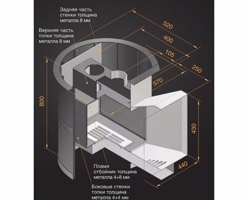 Топка печи выполнена из специальной конструкционной стали толщиной до 12 мм. Сталь благодаря своей устойчивости к высоким температурам не подвергается деформации. Топочная дверца изготовлена из высококачественного чугуна. Длинная колосниковая решётка из массивного литейного чугуна, обеспечивает равномерное горение дров, столь необходимое для банной печи. Выдвижной зольный ящик позволяет удалить накопившуюся золу, не прерывая горения и эффективно регулировать его интенсивность. Все эти характеристики позволяют утверждать, что эту модель можно считать самой скоростной печкой по прогреву парильного помещения.