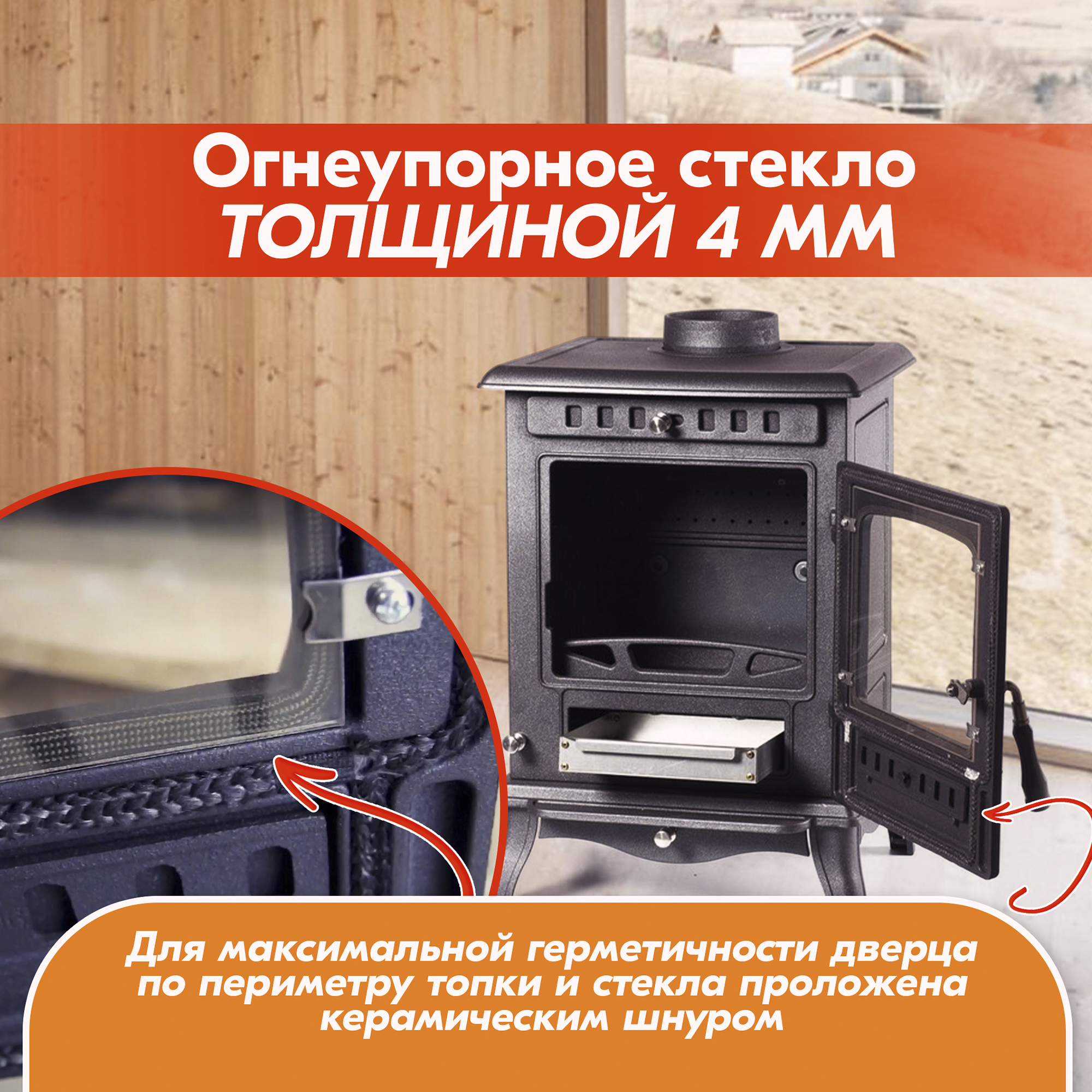 Чугунная конструкция печи-камина гарантирует прочность, долговечность и износостойкость на долгие годы использования.