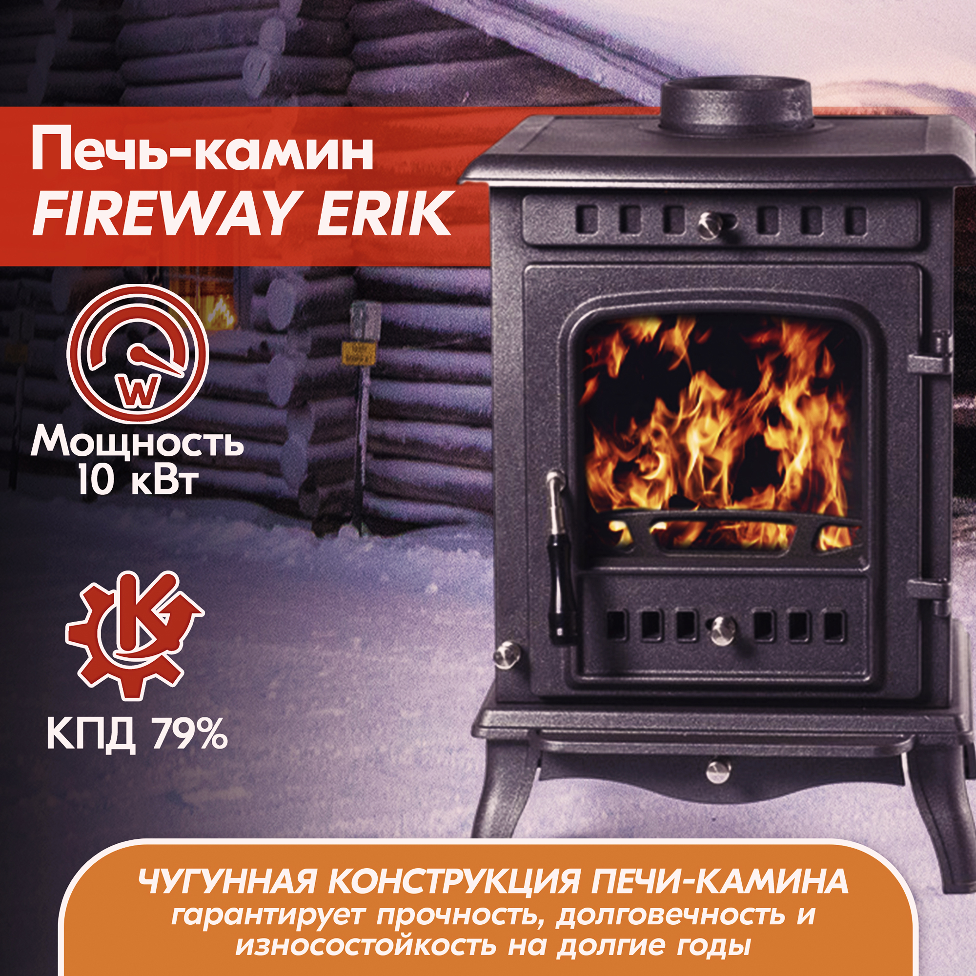 Чугунная печь-камин FireWay (ФаирВэй) Erik (Эрик) – это функциональная, компактная и красивая отопительная печь для загородного дома или дачи, эффективно накапливает тепло и долго остывает.