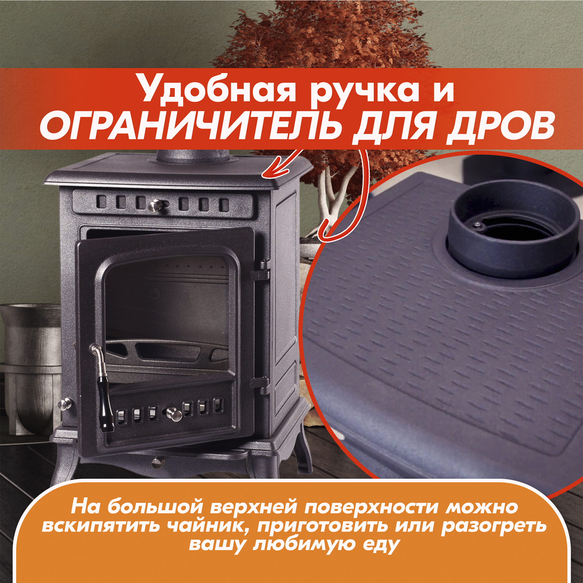 - на верхней крышке печи-камина можно вскипятить чайник, приготовить или разогреть вашу любимую еду, места для этого достаточно;