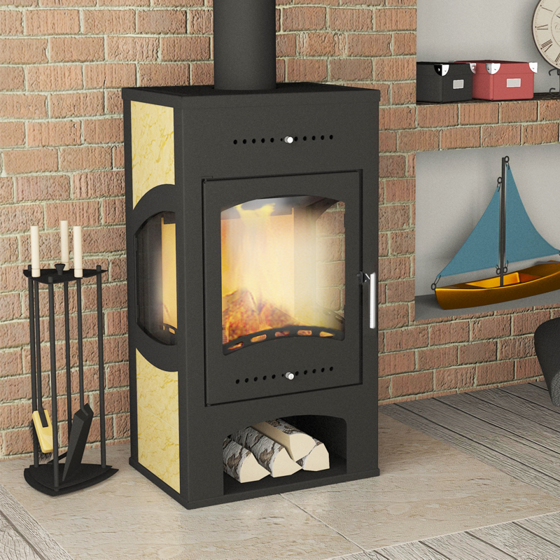 Оборудована дверцей и боковыми окнами, что позволяет наблюдать за огнем на 180 градусов.