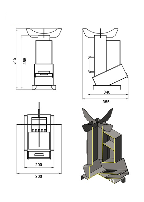 Данная печь отличается своей экономичностью в потреблении дров и отдачей на выходе максимального количества тепла за счет реактивной тяги созданной самой конструкцией печи.